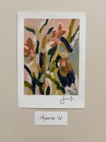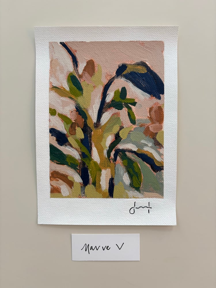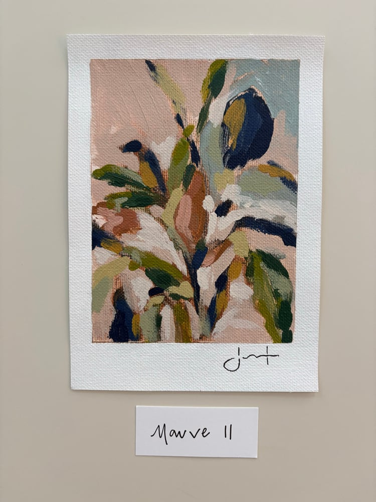 These botanical minis are small studies in movement and color—each one an intuitive layering of brushstrokes that captures the feeling of florals rather than the form. Painted on raw canvas with soft mauve grounds and earthy greens, they balance structure and spontaneity in a way that feels both grounded and airy.
