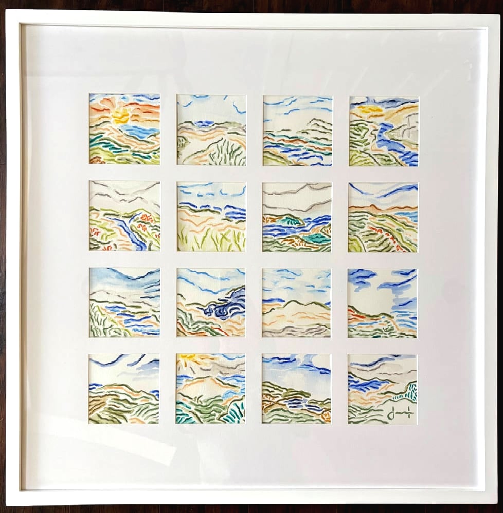 Composition of (16) 5 x 5 inch squares. Study of ocean landscapes. Contained in a white frame measuring 28 x 28.